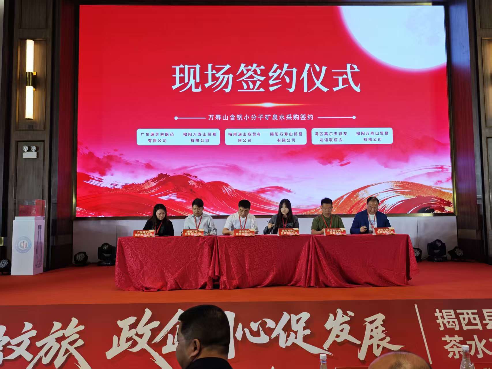 签约仪式上,多家企业达成合作协议,涵盖茶叶采购、矿泉水销售及文旅项目开发三大领域。其中,“大洋红”茶叶与多家采购商签约,万寿山矿泉水成功和各地经销商签约,樱花茶园文旅项目和多个旅游合作项目也正式落地。此外,揭阳市万寿山贸易有限公司被授予“揭阳市大健康产业协会副会长单位”称号。活动的压轴环节是“云顶茶市”启动仪式。与会领导嘉宾共同按下启动屏幕,标志着揭西县茶产业与文旅融合迈入新阶段。
