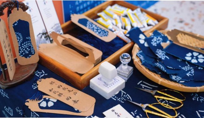 店内同步展出本地蓝印花布非遗作品,并设置拓印体验区,读者可以亲手制作明信片带走,让传统工艺与当代阅读空间产生奇妙的化学反应。