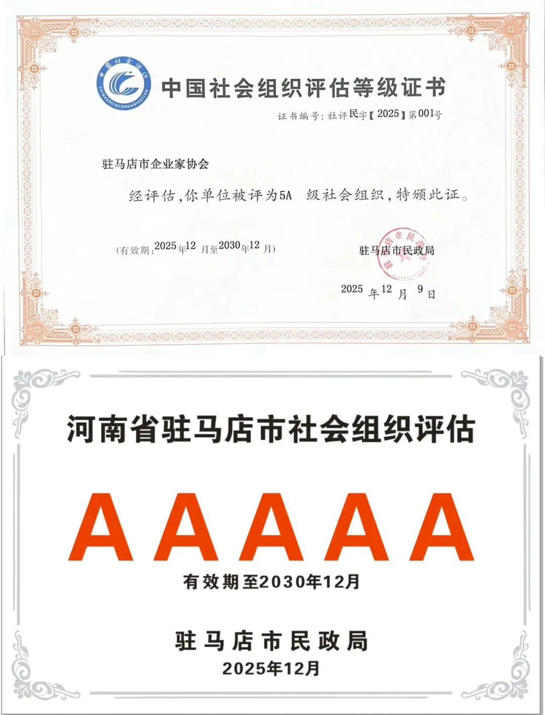 2019年,驻马店市企业家协会被评估认定为 “AAAA级社会组织”称号。又历经六年的发展过程,通过党建为引领,不断加强理事会和秘书处队伍建设,提升服务企业家的能力和水平,开展了一系列丰富多彩的社团活动。凭借十年服务企业家发展的卓越表现,2025年被驻马店市民政局评估认定为“AAAAA级社会组织”称号。这一荣誉不仅是对协会规范化建设与专业化服务能力的高度认可,更彰显了驻马店市企业家协会在全市社会组织中的标杆作用。