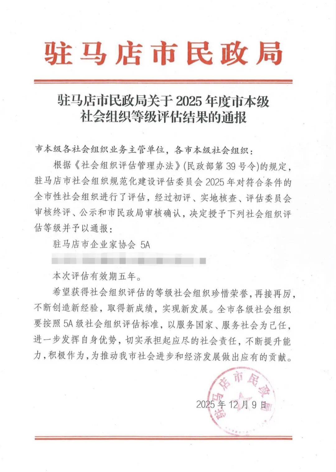 2025年12月9日,驻马店市民政局发布《关于2025年度市本级社会组织等级评估结果的通报》,根据《社会组织评估管理办法》的规定,驻马店市社会组织规范化建设评估委员会2025年对符合条件的全市性社会组织进行了评估,经过初评、实地核查、评估委员会审核终评、公示和市民政局审核确认,决定授予驻马店市企业家协会为“AAAAA级社会组织”称号。