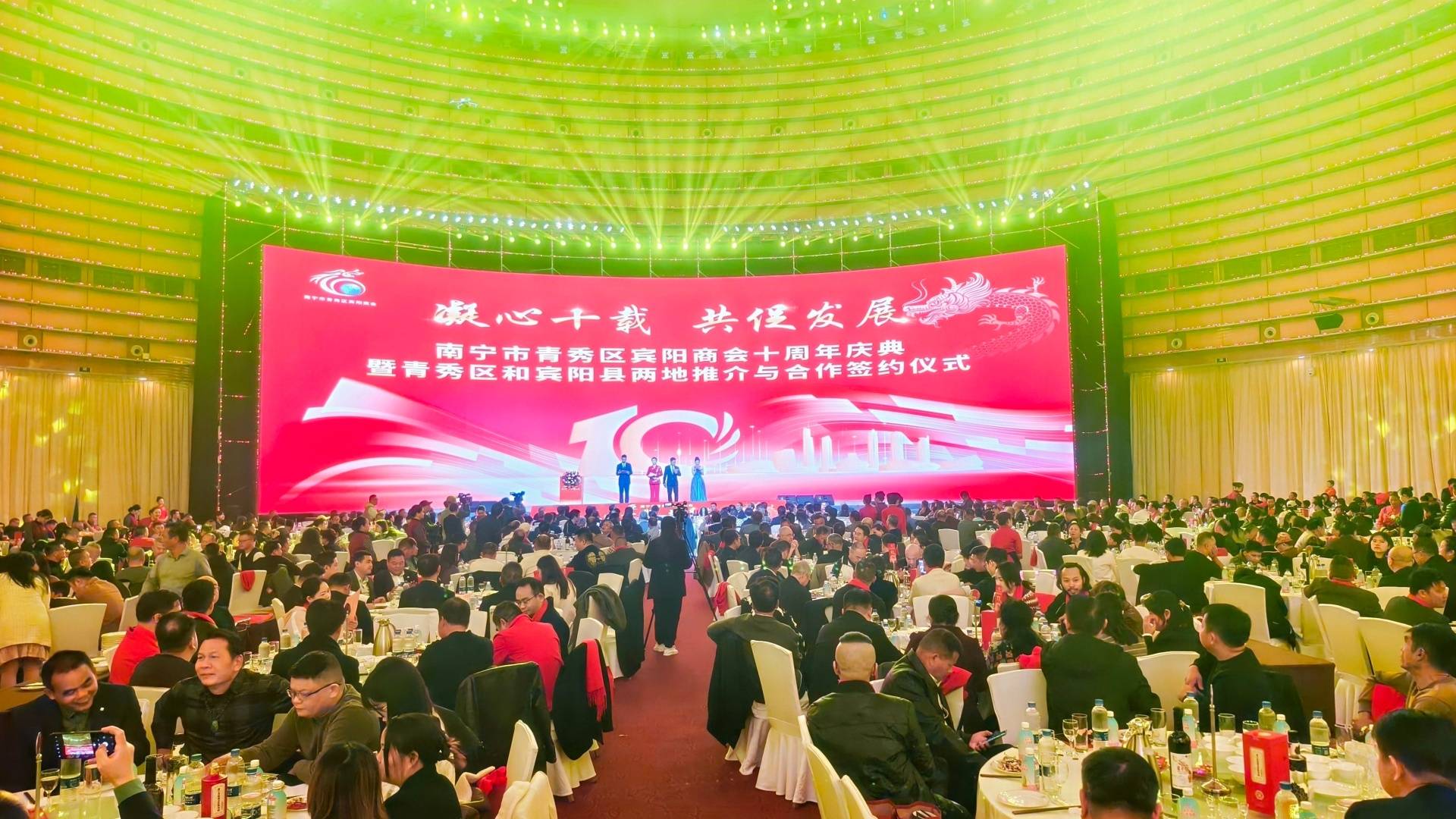 风雨十载凝合力,同心致远启新篇。12月28日,南宁国际会展中心灯光璀璨、宾朋云集,由南宁市青秀区宾阳商会携手青秀区工商联、宾阳县政府联合主办的“凝心十载 共促发展”十周年庆典主题活动隆重举行。活动同步开展南宁青秀区与宾阳县区域合作推介、重大项目签约仪式,来自两地政府相关部门领导、商会全体会员、宾阳籍乡贤代表、异地商协会嘉宾及各行业企业家代表齐聚一堂,共同见证南宁宾阳商十年辉煌,共绘区域协同发展新蓝图。