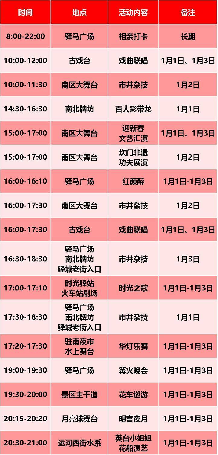 时间、地点:1月1日、1月3日10:00-11:00;16:00-17:00(驿马广场、南北牌坊、驿城老街入口 );1月2日10:00-11:00;19:00-20:30( 南区大舞台)