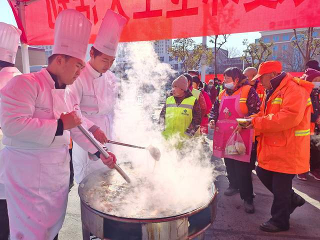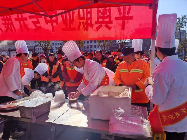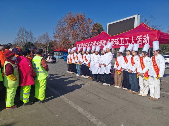 春寒料峭的舆兴广场,因一场爱心之约暖意融融。2026年1月7日上午,平舆县中等职业学校在此开展“情暖环卫工 爱心伴同行”送温暖活动,100余名一线环卫工人受邀而来,学校2024级厨师班的10余名学生代表现场奉上精心烹制的热乎的免费午餐,用技能与爱心为城市“美容师”驱散寒意。