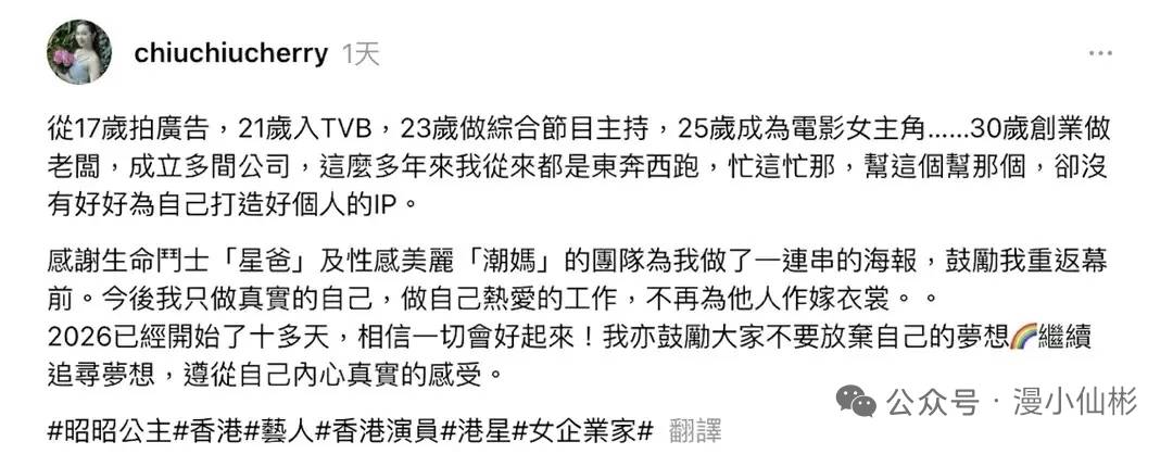 而48岁的陈昭昭年初刚以“做真实的自己”为宣言官宣复出,便成为港圈焦点。这位TVB第11期艺员训练班出道的艺人,从影视演员、节目主持人到跨界经商、投身公益,人生经历充满故事性,曾获柬埔寨国王颁发勋章,在东南亚及大湾区商界都有不俗布局。