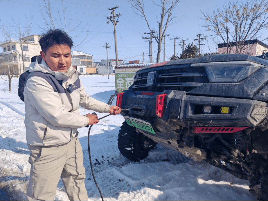 抵达现场后,郑凯强迅速观察地形,凭借丰富的救援经验和坦克400越野车强劲的四驱性能、高通过性,制定了科学的救援方案。他熟练操作救援装备,一边指导高师傅配合调整车辆位置,一边徒手清理车辆周边的积雪与杂物,在寒风中忙碌的身影格外坚定。经过半个多小时的紧张作业,被困车辆成功被拖出沟渠,恢复正常行驶状态。
