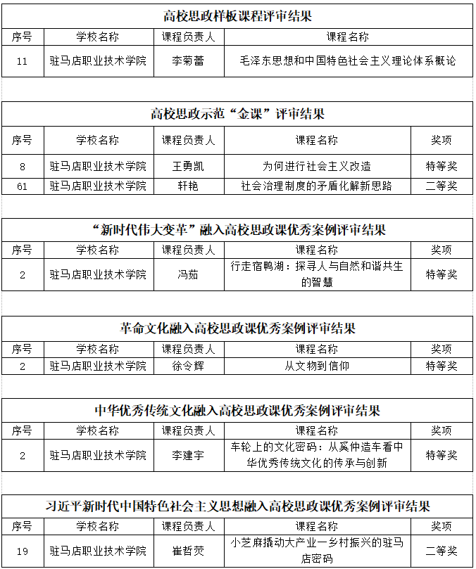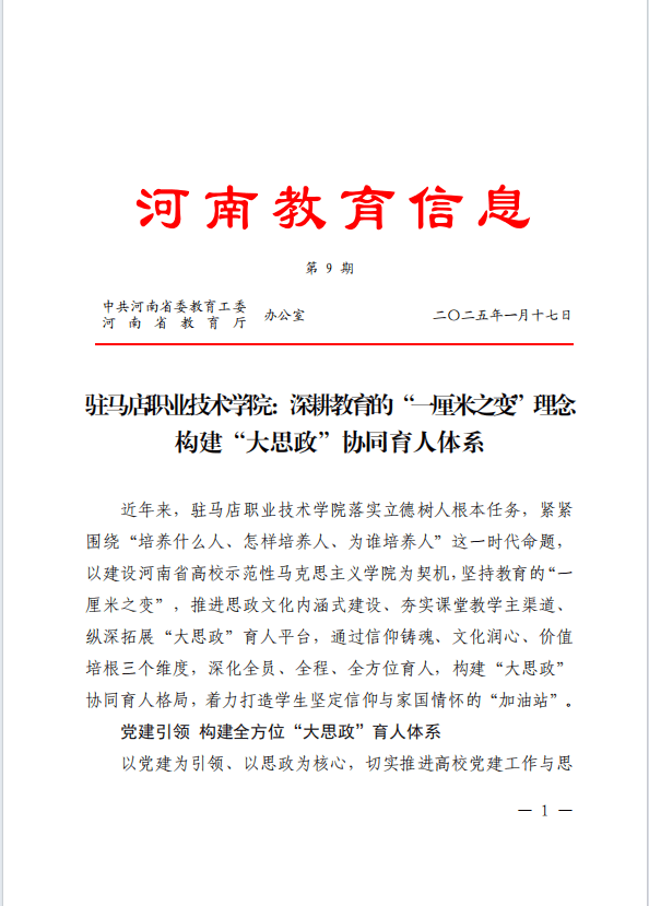 中共河南省委教育工委办公室、河南省教育厅办公室公布 2025 年度优秀思政课程资源评审结果,驻马店职业技术学院教师在多个类别中表现亮眼、斩获佳绩,成功获批高校思政样板课程 1 项,斩获特等奖 4 项、二等奖 2 项。此次成绩的取得,得益于学校党委长期以来对思政课程的高度重视与大力支持,充分彰显了驻马店职业技术学院思政课教师队伍扎实的理论功底、精湛的教学技艺与锐意进取的创新精神。