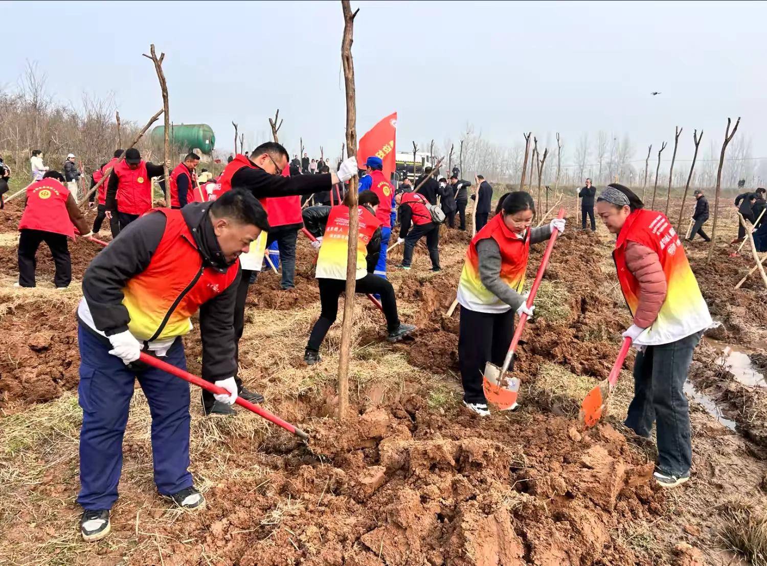 当天上午,春风拂面,旗帜飘扬,植树现场一派热火朝天的劳动景象。驻马店市天中义工联合会的志愿者们统一着装、精神抖擞,严格按照植树技术规范有序作业。挥锹挖坑、扶正树苗、培土围堰、提桶浇水,每一道工序都认真细致、规范到位。他们干劲十足,汗水浸湿衣衫也不停歇,青联委员与义工们默契配合、相互鼓劲,铁锹起落间泥土翻飞,“志愿红”与“生态绿”交相辉映,构成春日里最动人的劳动画卷。