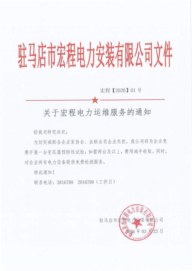 为切实减轻企业用电成本、筑牢生产用电安全防线,助力本地营商环境持续优化,驻马店市宏程电力安装有限公司于2026年3月23日发布宏程〔2026〕01号文件,面向全市企业家协会、企联会员企业推出专项电力运维惠企服务,以专业技术与惠民举措为企业生产经营保驾护航。